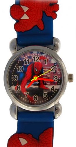 Spiderman watch with blue jelly band. Children's size. Has laser cut Spiderman and logo on the band. Silver tone case of approx. one inch diameter. Can arrive with random spiderman picture on face of the watch.