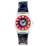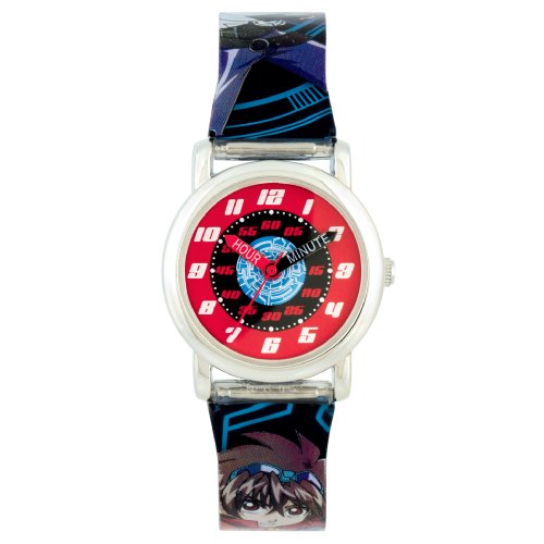 A fun way to learn to tell time, the Bakugan Kids' Black and Blue Easy Read Character Strap Watch features a striking, colorful dial with large, Arabic numeral indexes around the outside perimeter and minute indexes on the inner perimeter. The bold, black and red hands have "hours" and "minutes" printed on each hand as a useful teaching tool. Fans of Bakugan will love the cool, graphic pattern printed on the watch band, which is secured by a sturdy buckle clasp. Plus, the watch has a durable plastic bezel and window, so they can play as hard as they want. The Bakugan Kids' Black and Blue Easy Read Character Strap Watch is powered by reliable quartz movement.