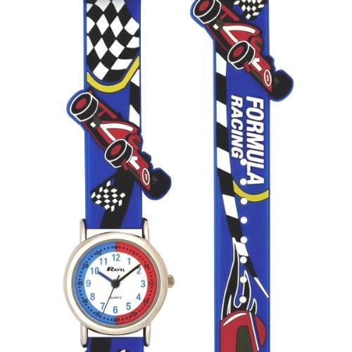A simple and fun childrens analogue watch by Ravel, this is a no-frills wrist watch that functions to a high capacity, serving any child well for every day use. This watch has been designed to teach children to read the time easily and in an exciting and motivating way. The round case white dial is clear to read and features a time teaching display with minutes past the hour marked in red and minutes to the hour marked in blue. The watch has 3 hands - an hour hand, a minute hand and a second hand, with blue numbers to compliment the strap. The blue watch strap is made from rubber-feel PU and has 3D pictures of racing cars and checkpoints. The strap fastens with a stainless steel silver tone buckle on any of the 8 holes. This is the perfect gift for kids. *Watch length when fastened on tightest hole: 15cm *Watch length when fastened on loosest hole: 18cm Supplied With: * Watch * Guarantee Card Product Description : * Quartz Analogue * Metal Case * PU Strap * Time Teacher Feature If a box is displayed on the photos, this is how your watch will be supplied. If no box is shown, it is because the supplier did not provide us with boxes for the watch, and the price obviously reflects that. We will of course ensure that your watch is well protected during transit.