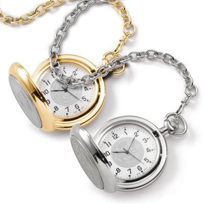 Who hasn't looked at a soldier's uniform and wondered what all of the insignias,ribbons, medals, badges, tabs and patches mean? Each of these items represent the successes of that solider, or their unit, and are worn with pride. Our polished silver-finish or gold plated pocket watches are the perfect gift to commemorate your soldier's array of accolades. With the military emblem on the front, all it needs is your personal message on the back. Tuck it into its complementary black presentation box (which can also be engraved), and this is apresent that will be cherished forever. Engraved Gift.